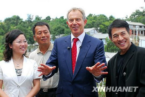 星岛环球网消息:应邀参加“生态文明贵阳会议”的英国前首相托尼·布莱尔与影视明星、“壹基金”发起人李连杰,22日来到贵阳市花溪区党武乡摆贡寨参观,并共同启动“太阳能LED照明千村计划”。摆贡寨是该计划的第一个示范村庄。