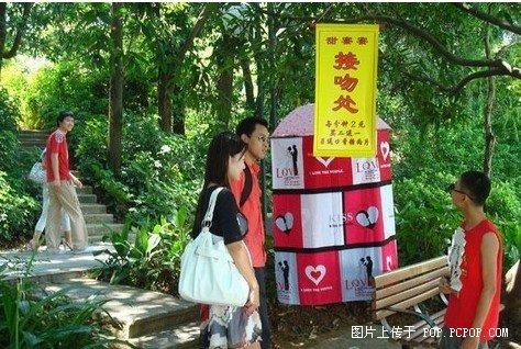 2009年7月8日13时许,深圳莲花山公园小湖的西岸边,惊现雷人一幕。曾在今年六一儿童节在深圳中山公园门口坐宝马“钓后妈”的13岁男童,又出雷人怪招。其用一把带有心型图案的粉红色雨伞和一个带有接吻图案的花床单,制作成一个花轿式“接吻处”,并悬挂在树枝上进行“经营”。接吻处上方还挂着一个很雷人的广告条幅,上面写着“甜蜜蜜接吻处,每分钟2元,买二送一,另送口香糖两片”。男童手里还轻摇着一把写着“自谋职业,谢谢支持”字样的折叠扇。其举止言谈,很象是一个生意老手。 男童的“独特经营”,不时吸引游人回头观望。不到半小时时间,便有两对情侣上前捧场。