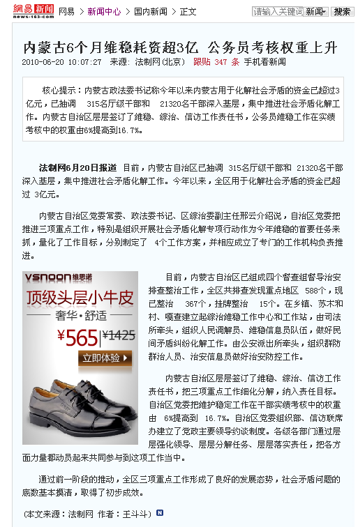 内蒙古半年维稳耗资超3亿 占官员考核比重上升
