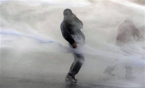 3月24日比利时警方用催泪瓦斯和高压水枪驱散示威者