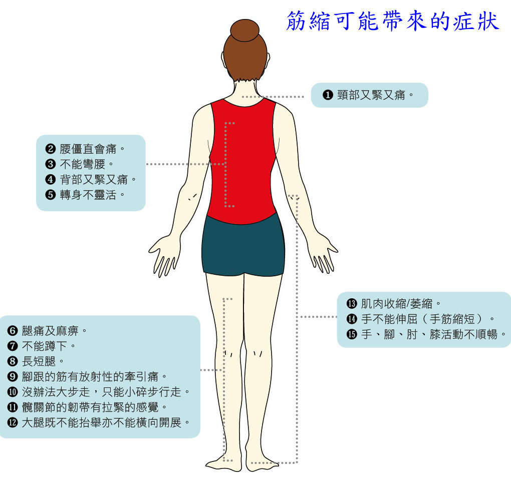 筋縮者除了下垂的腳無法著地外,屁股也無法貼靠立柱,上舉的腿也無法打直。
