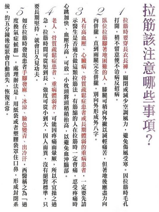 • 拉筋的重點:第一是“靜心”,第二是“停留的時間”,第三才是“拉緊的程度”。如果沒有靜心,就無法進入氣功狀態!