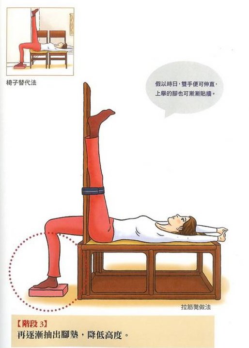 • 筋初步拉緊之後,要靜止不動,靜靜等候筋鬆軟的信號,通常1~2分鐘後,就能感受到筋已經鬆軟了,這時候才可以進一步拉緊(屁股往立板再貼近一些)。請注意!在未收到筋鬆軟的信號前,嚴禁進一步拉緊!