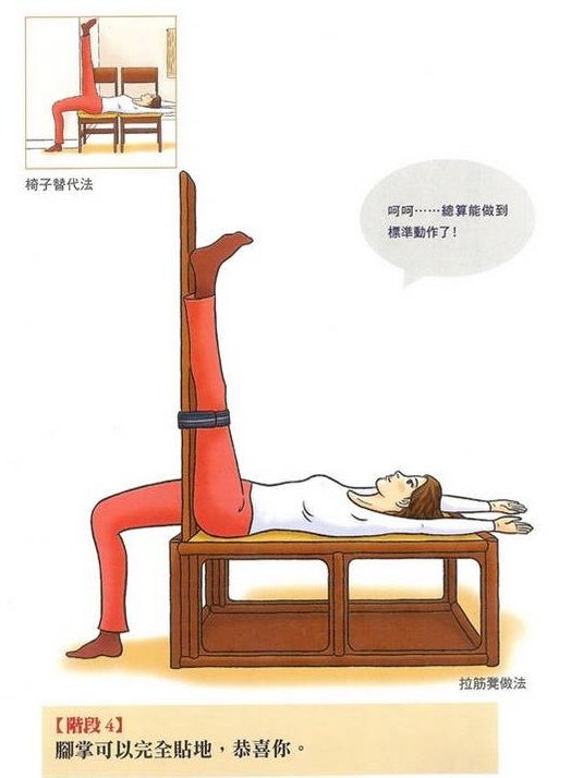 • 進一步拉緊仍然要遵守可以緊,可以酸,但就是不能痛!的原則,否則筋仍然會被扯裂!