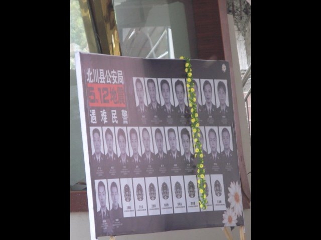 在县公安局损毁的大楼前,一个告示版上张贴着遇难警察的照片,共有28人。