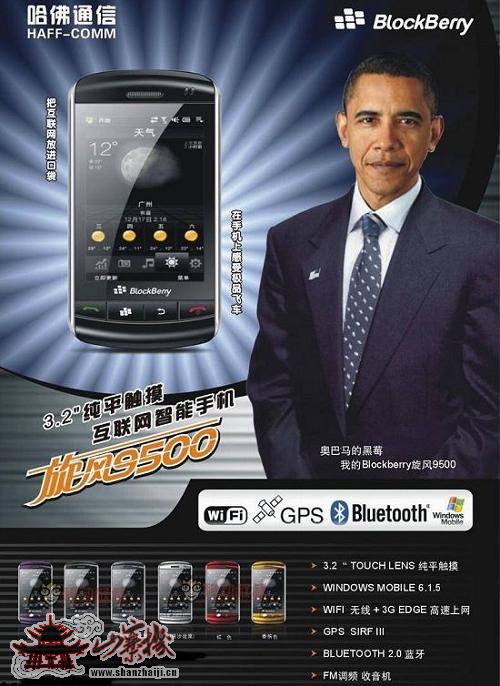 作为山寨机之父的联发科在智能手机解决方案上被华为海思给赶超了,新近曝光了一大批采用华为海思K3方案的智能手机,也使得智能手机山寨化成为了一种趋势。目前一款名为BlockBerry旋风9500的山寨机更是以奥巴马代言雷到众人