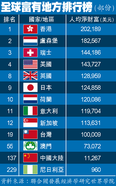 【本報訊】香港這彈丸之地是全球最富庶的地方?不錯,聯合國最新發表的一份報告顯示,香港人均擁有淨財富 202,189美元(折合約 157.7萬港元),成為全球 229個國家和地區中最有錢的地方,人均財富是全球最窮的西非國家尼日利亞人的 210倍,盧森堡和瑞士則分踞第二和第三位。兩岸三地中,過去 20年經濟高速發展的中國大陸以約 8.8萬港元的人均淨財富位居第 137位,遠遠落後於平均個人財富 78萬港元、排名全球第 19位的台灣(見表)。