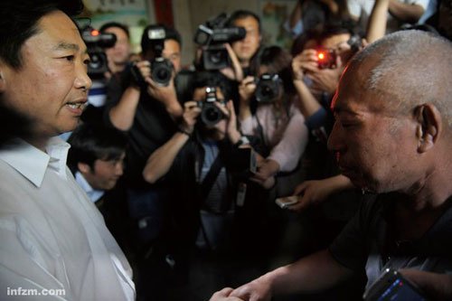 商丘政法委书记王建民握着赵作海(图右)的手说:你蒙冤入狱11年,这是商丘政法部门的耻辱。法院带来的记者问赵作海,你要感谢谁?他说感谢法院,感谢党。
