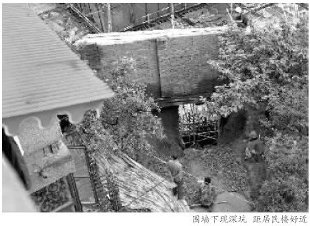 大坑出现的具体位置是小区21幢3单元,这里有一堵围墙。前天下午4点过,居民们就看到围墙下出现了坑。昨日凌晨,住在1楼的唐婆婆听到“轰隆”一声响,天亮后发现这个坑扩大了一倍,宽的地方有5米,最深的地方达7米。同时,旁边出现了小坑。围墙的另一侧是建筑工地。通过塌陷出来的这个坑,可以看见对面工地的情况。唐婆婆担心,这坑继续扩大下去,房子恐怕都不保,“我今晚不敢在屋里住了”。