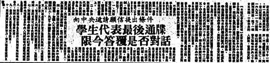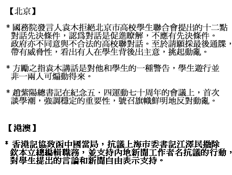 迫于四二七大遊行的壓力,中共導演了一場假對話。中共發言人袁木坐在「領導席」向學生訓話,學生「代表」則都來自官方學生會。昨天正式成立的北高聯不承認這是一次對話。