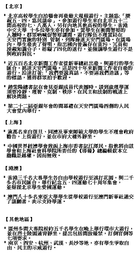 北京學生“五四”遊行浩浩蕩蕩﹐勢難阻擋。外圍的糾察隊手牽手維持著良好的秩序。新聞界不願再做黨的“喉舌”﹐上街示威以爭取“講真話的權利”。“我要說話﹗”﹑“反對新聞欺騙”