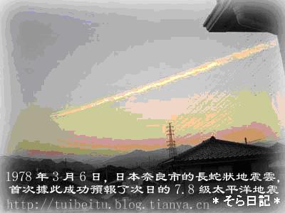 正式提出“地震云”的,是日本前福岡市市長鍵田忠三郎,他曾經亲身经历過日本福岡1956年的7級地震,在地震時看到了长蛇狀奇云,以后只要这种云出现,总有地震相应发生,所以他就把这樣的云称为“地震云”。 1978年3月6日,鍵田在記者招待会上,突然发现了長蛇狀奇云(见图),鍵田当即停下演讲,向大家預报了地震。果然,次日上午发生了震中在太平洋的7.8級地震,整个日本震感強烈。 ffice