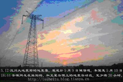 十四、卫星红外云图上可见地震中心在震前会出现“乱云”现象 网友“lhkcc58”和“wwssff333”通过观察卫星红外云图后发现,地震发生之前,在红外云图上总能观察到地震中心位置会出现一种“乱云”现象,因此认为“乱云”可作地震预报的根据之一。 据观察,这种“乱云”有如下特征: (1) “乱云”出现的位置非常稳定,有时附近其它云彩位置已经移动了非常多,但“乱云”却可以几个小时甚至十几个小时保会位置不变。 (2) “乱云”形态怪异,象是云中会长出毛刺一样,毛刺伸出方向无规律,与其它云彩形态明显不相同。 (3) “乱云”在红外云图上都呈白色。 (4) “乱云”可突然出现或消失,“乱云”位置的云彩如果开始位移,就不会再保持原来的“乱云”形态。 这“乱云”到底是怎么回事呢? 我认为地震发生之前出现的“乱云”是地震预兆头的一项重要征象之一。 岩浆潜流之间发生局部摩擦或局部地质发生挤压时,地面应力场就会发生变化,这就可能导致地面山脉间出现温度差异现象,这种山脉间的温度差异可以被卫星上的红外摄像捕捉到,在红外卫星云图上表现的就是这种“乱云”现象,所以这种“乱云”位置相当稳定,不随其它云系而飘移。当这种“乱云”消失后,其它云系在这位置刚好飘移经过时,我们当然看不到原先的“乱云”征象了。