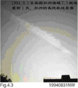 地震云是一种有自发光特征的“云”,这种“云”根据电离层被轰击的高层气体的不同而呈现不同的颜色,大多数为日光灯样苍白色,看似在云中装有千百万支日光灯。 强地震往往是地震云与地光同时伴随出现,地震的震级愈高,地震云的色彩往往愈鲜艳。 (1)“地震云”出现时如果没有“云彩”就只能看到“地光”,七级以上大地震前均会产生“地震云”或“地光”。 (2)当“地震云”或“地光”出现后,将在120小时内发生6级以上强地震,震级愈高,“地光”愈强。 (3)直接处在地震中心看不到“地震云”\地光”现象,只有在相距地震中心数百公里的地方才能观察到“地震云”或“地光”,这是因为地震中心上空虽然电离层已被压缩且被太阳风高能粒子撞击而发光,但总体来说电离层空气极其稀薄,所以在本地看不到,必须在远处才能看到,这个原理就如在近距离看不到空气的颜色,但看天空就知道空气是有颜色的,是天蓝色(4)六级以上强地震可能在地震发生之时“地震云”与“地光”会同时伴随,但也有可能“地震云”与“地光”出现后又消失,几个小时后甚至几天后才发生地震,真正发生地震时并没有“地震云”和“地光”同时出现。 (5)只能在东北方向才有可能发现距离超过1300公里以上的“地震云”,在其它方向发现的“地震云”都是在大约1300公里以内,产生的原因是因为“地震云”位于太空电离层高度,不跟随地球自转而移动。 (6)在东北方向发现的“地震云”若观察不到“地光”现象,说明观察点相距地震中心距离超过1300公里以上,若在其它方向发现“地震云”,距离肯定在1300公里以内(大概值),并且会同时观察到“地光”现象。 (7)西北或西南方向出现的“地震云”或“地光”,若相距观察者1300公里左右时,可能观察到的“地震云”和“地光”几分钟后就会消失,因为观察者站在地面随地球自转而移动,但“地震云”在电离层高度不跟随地球自转而移动,相距1300公里左右西北或西南方向的“地震云”和“地光”很快就会消失在地平线以下而淡出观察视野。 (8)在西面方向发现的“地震云”有可能是在东面方向发生地震,这是因为震区上空出现“地震云”后,接着岩浆潜流交融现象就已经自然恢复,局部地磁已经正常不再产生“地震云”现象,此时因为地球自转原因,可能会在西面方向见到原来产生的“地震云”,而实际局部引力已经失去平衡即将要发生地震的位置却是在东面方向。 (9)“地震云”刚生成时,如果能被二个观察点同时看到,在地图上作交叉标识就能确定将要发生地震的震中位置(所用地图必须是以磁北为坐标绘制的地图)。但是,如果观察颜到的“地震云”是先前生成的,此时地震中心实际地磁已经正常,那么随着地球自转所产生的位移也会使所交叉的“震中位置”出现向西偏移现象。 (10)典型的“地光”容易观察,但有不典型的“地光”会以“会发光的雾”为表现形式,特提醒注意。 (11)由于“地震云”是位于电离层高度不跟随地球自转而移动,但观察者是站在地球表面随地球自转而移动的,所以观察“地震云”时因地震中心距观察者的距离、方位不同,会造成能观察到“地震云”的时间长短也不同。所以说,若建立“地震云”观察站就必须全天候观察,仅利用爱好者的业余观察非常容易漏报。 (12)发射专用人造卫星探测电离层变化作地震预报没太大意义,因为探测卫星无法确认电离层开始出现变化之时间,因此也无法利用轨迹和速度来换算地震中心的准确位置,利用探测卫星只能知道地面可能近期内会发生地震,但无法确定会发生地震的准确地理位置。 (13)如果白天发现疑似地震云可用如下方法确认:因为普通云系高度不会超过10公里,而地震云是位于50公里至200公里甚至400公里高度的电离层,在相隔300公里以外的二处观察点,如果可以同时观察到该疑似地震云,则可断定为是“地震云”。因为在相隔300公里的二个观察点相互间是不可能同时观察到对方上空的普通云系,只有在电离层高度的“地震云”才有可能被二个点同时观察到。