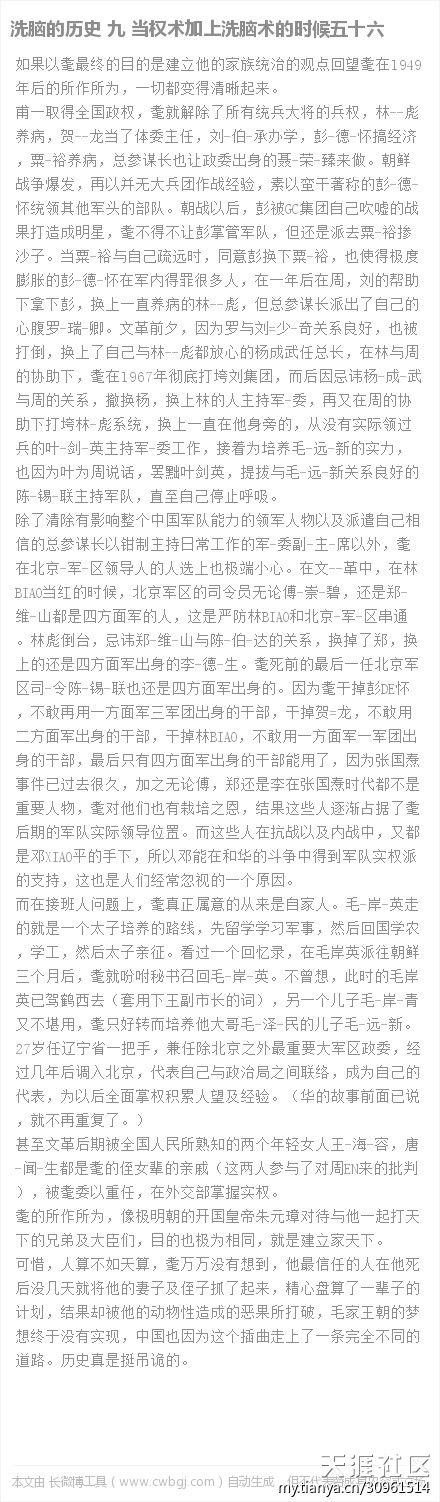 傅某人的帖子对ZG的历史进行了另外一番描述,看来让人感觉分外新鲜。但傅某人在批判洗脑的同时也在有意无意的使用着洗脑的方法,比如傅某人把一些未经确认的野史作为论据阐述,又或直接发表论点而无相应的论据支撑。这些问题都让我觉得这篇文章的可信性和可读性打了些折扣。