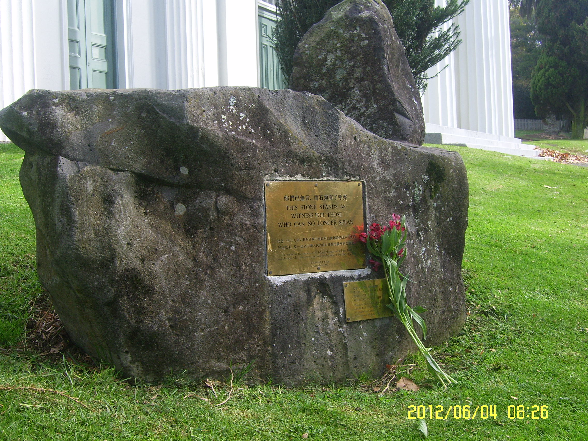 此碑于一九八九年九月十七日始立于St Andrew's Presbyterian Church , at the corner of Symonds Street & Alten Road, Auckland City. 奥克兰大学的音乐学院区.