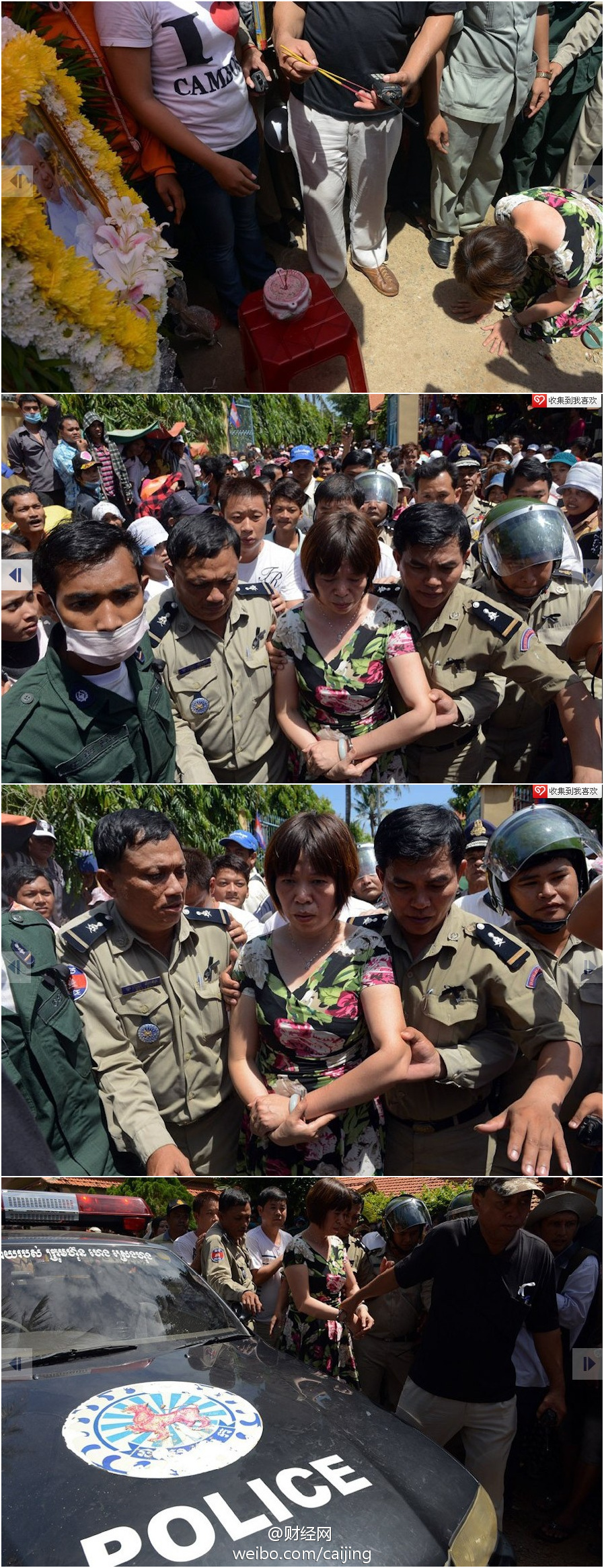 中国的财经网摘要转发了美联社的报导,并配发了一系列图片。其中有一张显示,那位戴着手铐的中国籍女子在柬埔寨人的四面围观中面向西哈努克画像下跪。