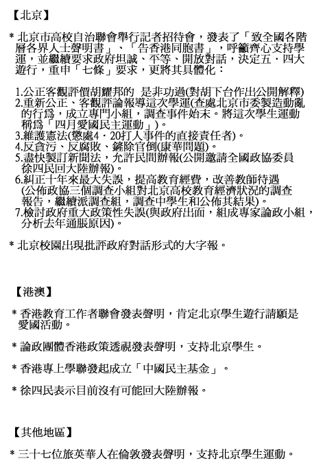 北京大學學生發起悼胡遊行並向人大常委遞請願信,提出七條要求,要點為: 一、重新評價胡耀邦同志的功過 二、否定『反資產階級自由化』、『反精神污染運動』 三、要求新聞和言論自由 四、公布政府部長級以上官員及其家屬的財產 五、取消北京限制遊行晌十條規定 六、增加教育經費,改善知識份子待遇 七、如實報道此次悼念活動