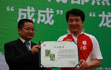 中国新闻网报道,当日上午,成都大熊猫繁育研究基地主任张志和与成龙签订了大熊猫认养协议书。当成龙将捐赠支票牌交给张志和主任时,原本打算出