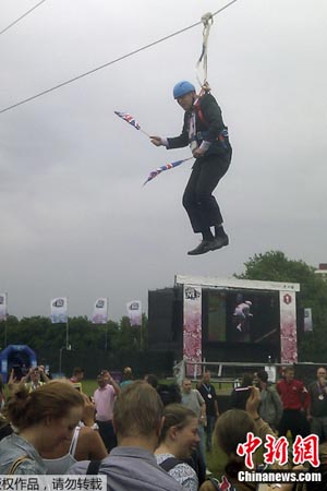 为庆贺英国队获得奥运会首枚金牌,伦敦市市长鲍里斯 约翰逊8月1日专程前往位于东伦敦的维多利亚花园玩“高空飞索”庆祝。