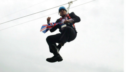 当天,他身着西装,头戴安全帽,双手举着英国国旗从高台上滑下。途中,约翰逊依然不忘挥动英国国旗以示庆贺。