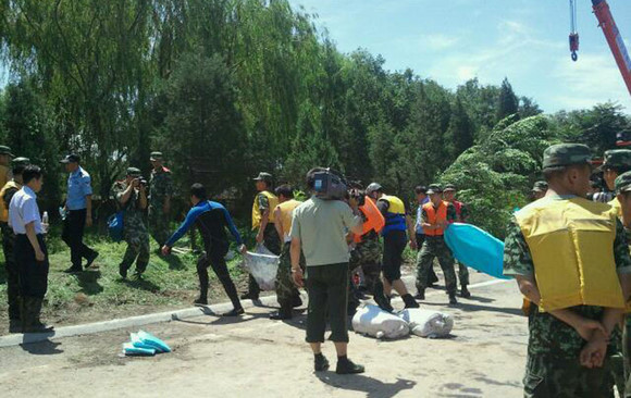现场有数百名**在用皮筏艇救援,十多俩消防车一直在排水。