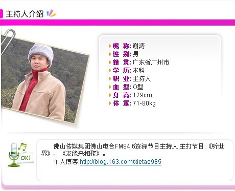 广东省佛山电台著名主持人,主持多种不同类型的节目,其中以《听世界》节目最受听众青睐和喜爱,《听世界》也是其初次尝试的节目形式。