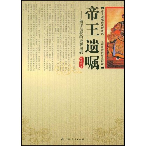 《帝王遗嘱:破译皇权的更替密码》讲述了皇权的传递做起来相当复杂,但说起来却相当简单。我们今天就是来说,因为帝制时代早巳经过去,谁也没有能力再来做了。人非神仙,孰能不死,若不是死于非命,每个人都会留下几句话给后人。大财主或许在身体健康、一切顺利时就对身后事有了专排,财产怎么分割,该给谁或者不给谁。总之,无论是穷人还是富人,他们所做的一切都是出自对后人的担心或者是关心。我们把普通人临死之际留下的话称之为遗言或遗嘱。如果这个要死的人是帝王,那么,他的遗言和遗嘱就称之为遗诏。