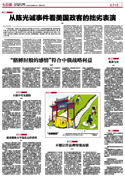 今天,中美两国关系的重要性怎么强调都不为过。但充满矛盾意味的是,美国政客动不动就会有不太成熟、不太体面的举动出现,似乎总想找茬敲打一番中国,似乎总想给前进中的中国社会找些麻烦,陈光诚事件就是一例,而这样的举动在明眼人看来,既无聊又拙劣。事实证明,中美关系要发展,主要障碍在美国。美国必须学会尊重中国的核心利益,必须学会适应与中国平等相处。“己所不欲、勿施于人”,打着“人权”、“自由”、“民主”等旗号制造事端,只能是自曝其丑,对中国不起作用,对美国自己更没好处。