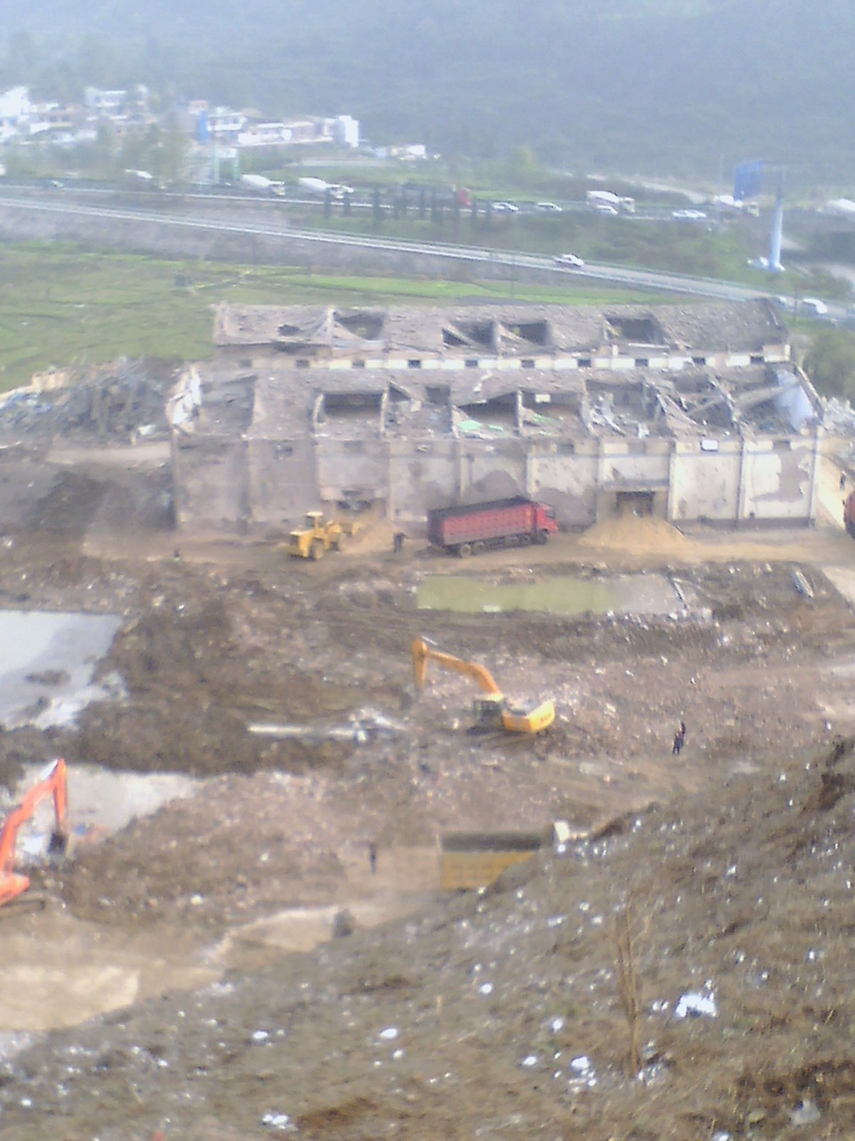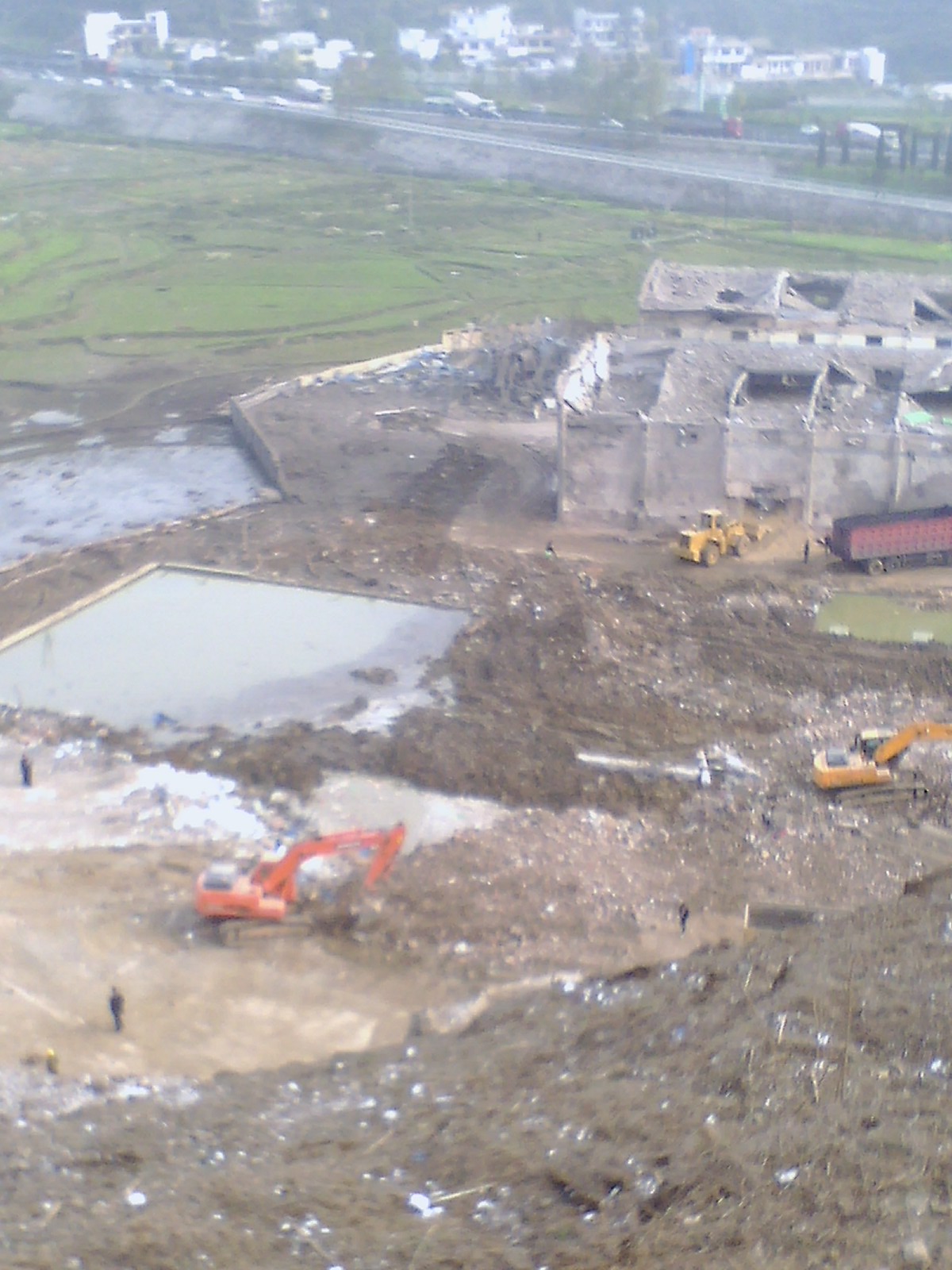 中间那一个圆形的大坑 便是两辆炸药车所停的位置 也是爆炸的位置 房屋早已被夷为平地