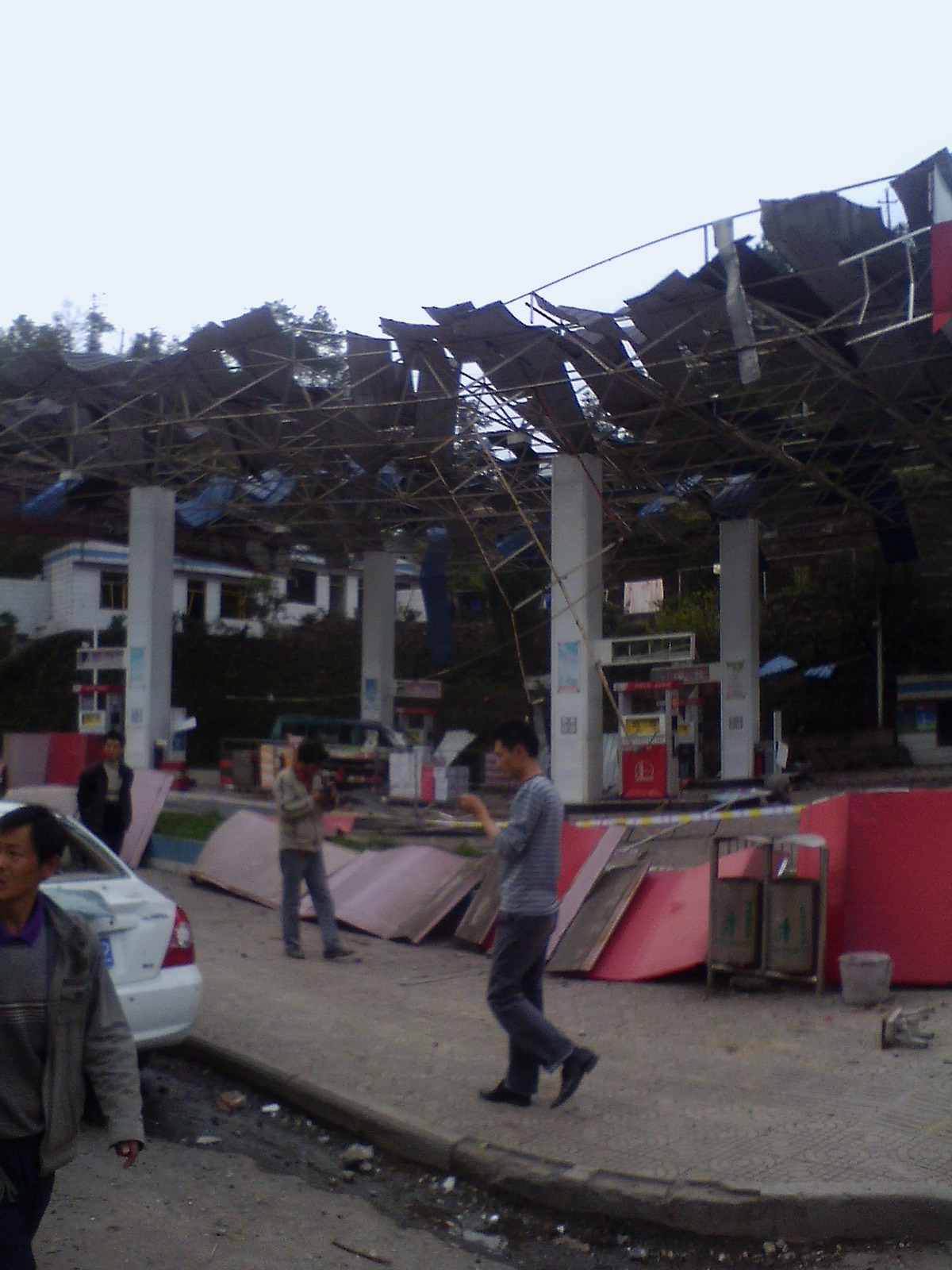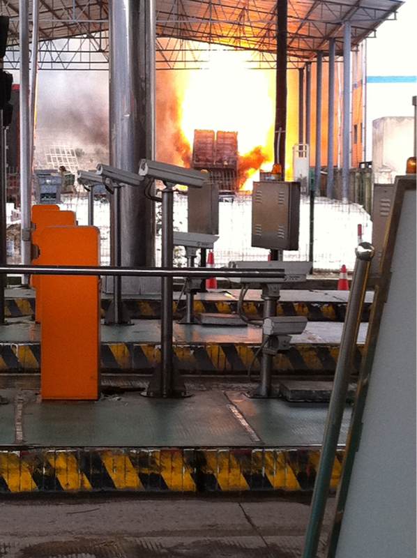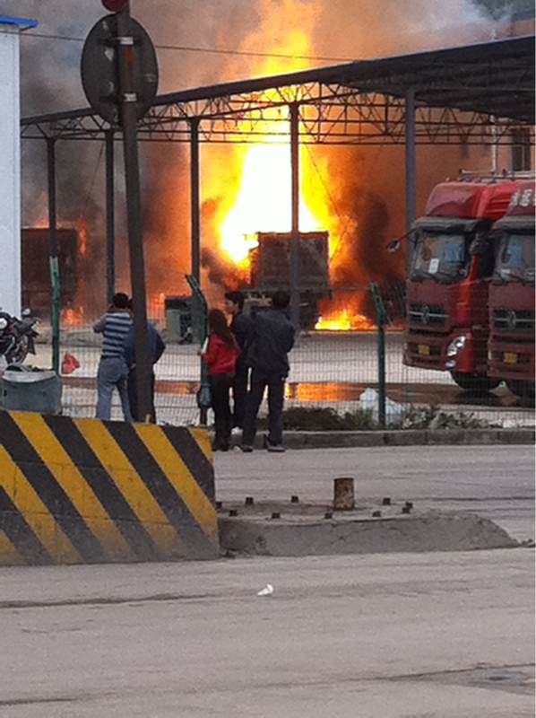 距离爆炸现场两百米的加油站 万幸的是加油站没有爆炸 假如加油站爆炸 后果不堪设想