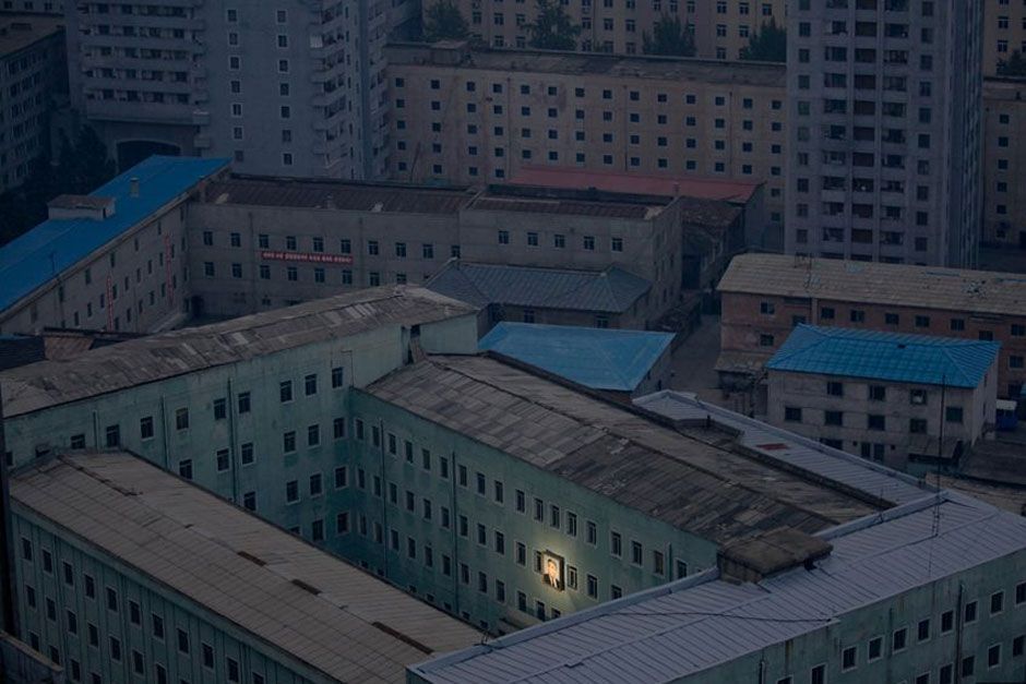当地时间2011年10月11日,摄影师公布了一张拍摄于朝鲜平壤的照片。图中,朝鲜前任领袖金日成的画像被挂在一幢居民楼上。目前,朝鲜各大都市仍面临供电不足的情况,当地电力系统会在清晨与其他特定的时段限制电力的供给。