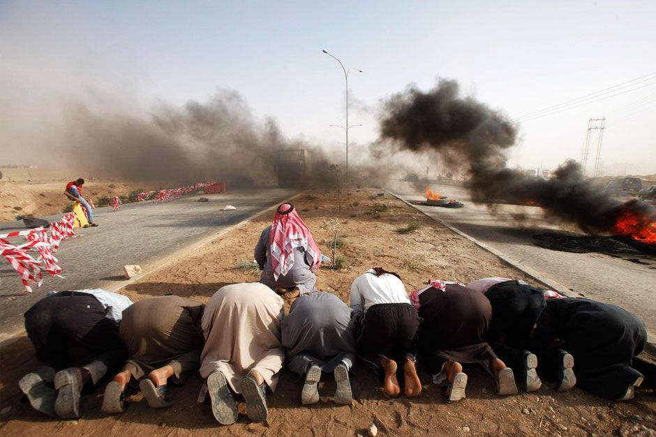 当地时间2011年10月12日,约旦,愤怒的约旦示威者在主要公路封锁段祈祷,这条公路距离连接安曼和北方及南方城市的阿丽亚皇后机场几千米。约旦部落和安曼南部的一些村庄居民用大石块和燃烧的轮胎阻挡了道路表示抗议,他们因政府发布的合并和租赁土地的公告很气愤。