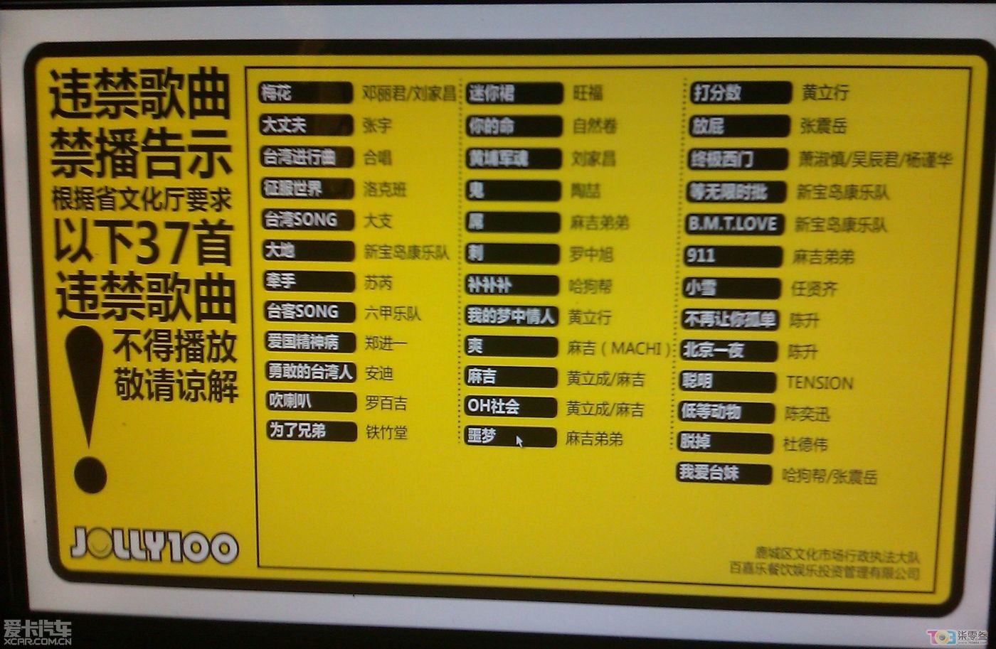 网友实拍禁唱曲目表,以下37首违禁歌曲不得播放。