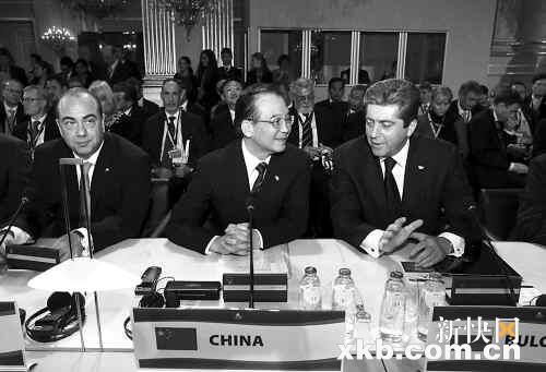 温家宝总理与保加利亚总统珀尔瓦诺夫交流。新华社发