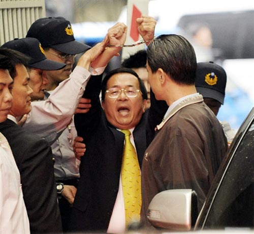 毋庸置疑,陈水扁是华人社会中第一个被“合法”地拷上手铐、经选票“合法”推出的“前领导人”。就此而言,以后的中国历史,怎么着也要写上一笔:“在中华民族走向民主的历程中,2008年11月11日下午,台湾前民选最高领导人因利用职权大肆贪渎被戴上了手铐……”。