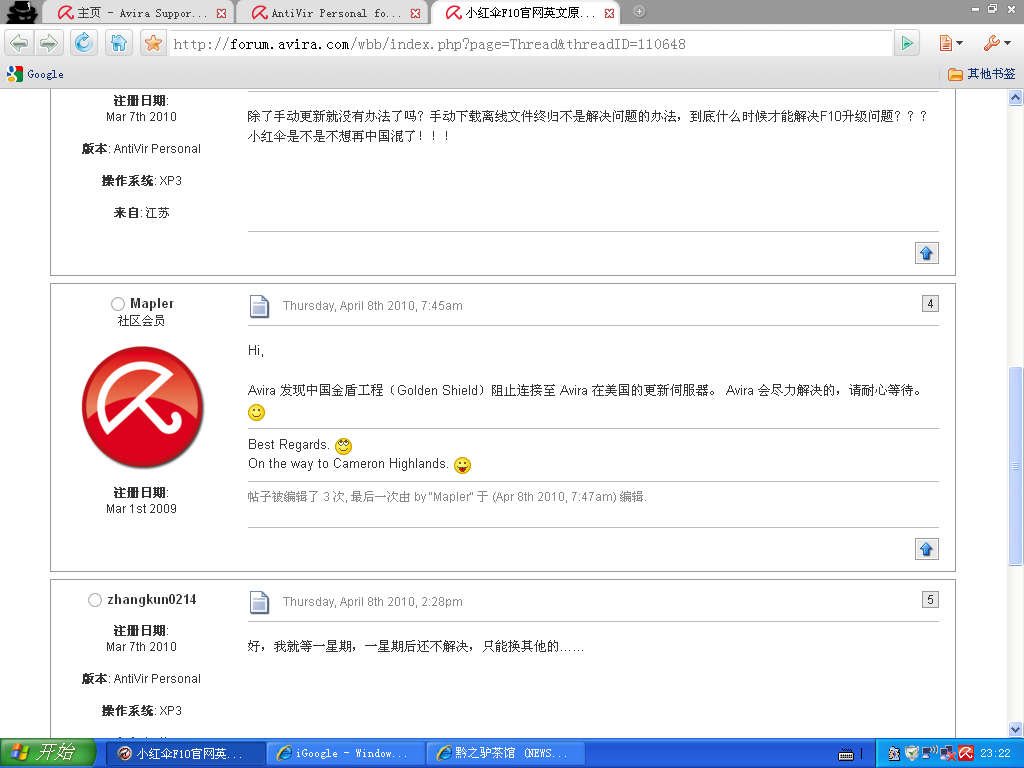 自从小红伞有了中文版后,更新就不正常了。这几天病毒库都更新不了,所以就到官网论坛上去看了一下。他们的管理员给出了答案,GFW阻止连接。
