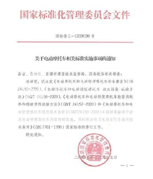 通知称,2009年12月15日,国家标准化管理委员会会同国务院有关部门和行业协会,共同研究了《电动摩托车和电动轻便摩托车通用技术条件》等4项国家标准的相关问题。考虑到目前电动摩托车是一个新兴的产业,制定好一系列相关配套政策还需要一个过程,经研究决定,标准中涉及电动轻便摩托车的内容暂缓实施。
