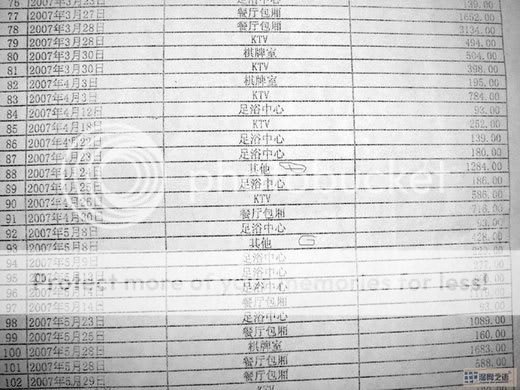 这两张账单,一张是2006年10月下半旬到12月底的消费账单,金额共是30137元,其中标注为“其它”项目的消费金额为2738元。另外一张账单是2007年3月底到5月底的消费明细账单,消费金额16950元,其中标注为“其它”的项目金额为1712元。 在显示清楚内容的账单中,消费项目基本就是“足浴中心”、“餐厅包厢”、“西餐厅”、“水疗中心”之类的。一个小小的局长,公款接待全都是这些地方?我们国家的办事人员都跑那些地方指导工作去啦…… 即便是上边来人需要接待,机关招待所不行吗?要谈点什么公事,传达点文件精神,会议室不好说,非得到足浴中心躺着,才能指导了文件精神?