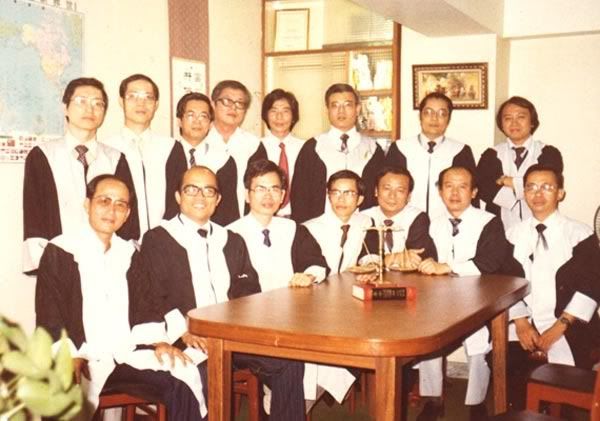(图十九 “美丽岛”案件的十五人辩护团,前排左二是苏贞昌,前排左四为谢长廷,后排左三为陈水扁)