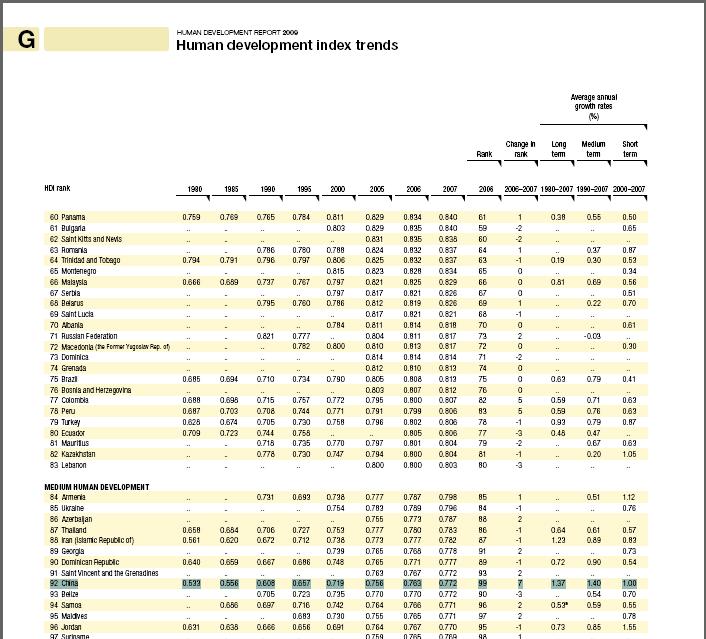 在2009报表里你去看表格G, 这是各个国家的HDI指数在不同年份的比较以及排名变化. 从1980到2007. 你自己去看看吧. 至于边上的数字92只是显示的序号, 我不清楚是什么意思. 但肯定不是2009年HDI指数的意思(这2009年还没过完呢, 哪里的HDI2009指数). 从表格后面几列可以看到, 中国的HDI指数上升确实是最大的. 俺上传了表格G的一部分的截图.