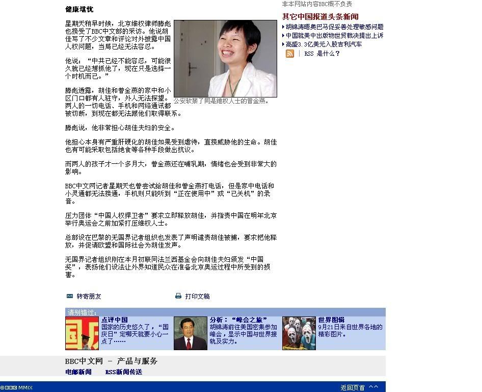 胡佳的妻子曾金燕不愿意对这样的猜测发表看法和感想。