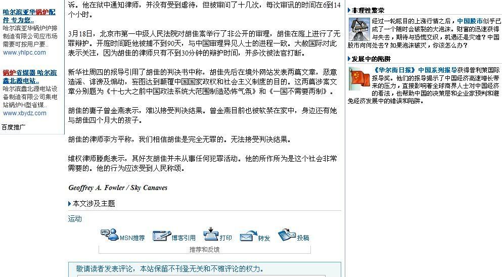 不过奇怪的是我去虹口区浙江北路时,马路边上一个广告牌上居然有“共创辉煌,与胡佳相会2008”的字样,当时一直以为是这个胡佳,想不到是同名啊,呵呵,怪不得没去掉