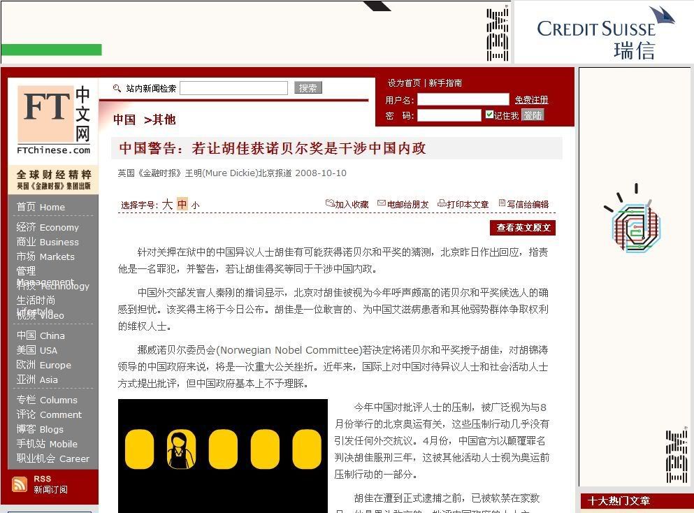 诺贝尔和平奖 ● 胡佳连续两年入围候选名单
