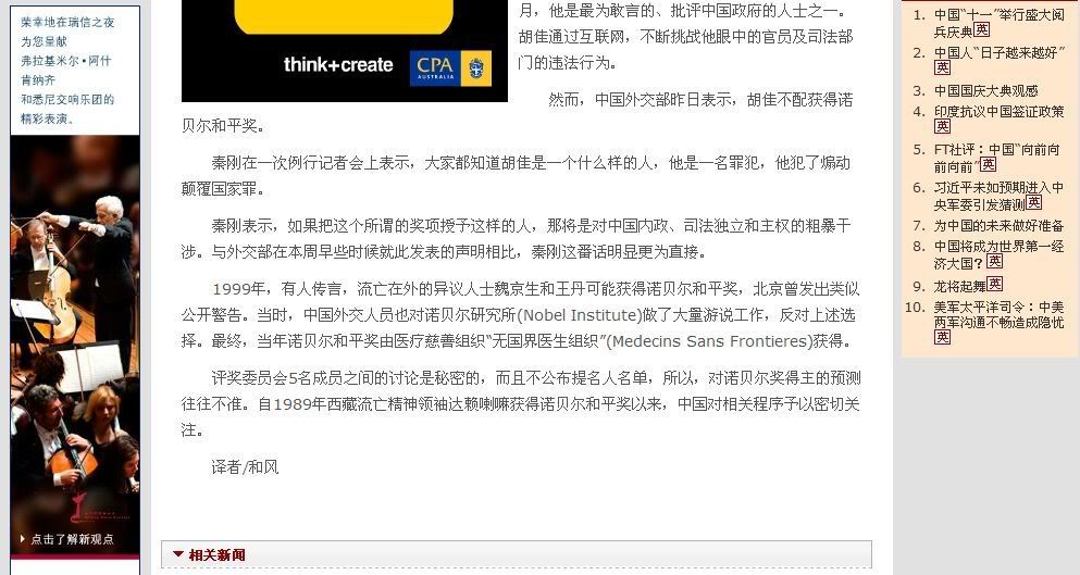 去年,针对胡佳入围的消息,当时中国外交部发言人刘建超说,诺贝尔奖评审机构,在人选方面应该做出正确的选择,“不要做伤害中国人民感情的事情。”