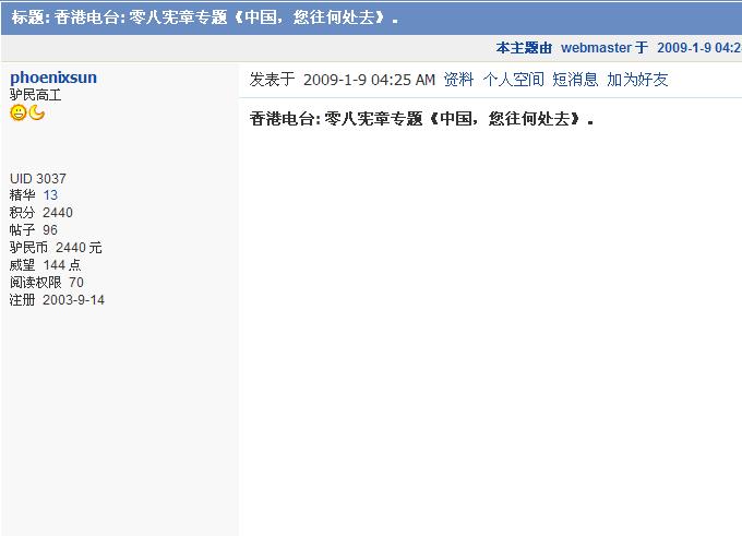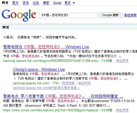 (博訊北京時間2009年1月09日 轉載)http://news.boxun.com/news/gb/taiwan/2009/01/200901090101.shtml 1月8日晚上7點,香港最大的香港無線電視翡翠台(TVB 電視台)播放了香港電台制作的零八憲章節目《中國,您往何處去》。節目的簡介稱:“內地一群知識份子在改革開放三十年之際,發表零八憲章,要求落實包括憲政在內的各種普世價值,得到海內外開明人士簽名支援,但發起人之一的劉曉波隨即被當局逮捕,反映中國的民主路仍然漫長。”