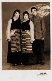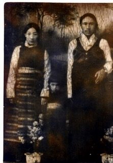1947年,我母亲的父亲作为噶厦噶伦、昌都总管拉鲁的管家,奉命去东部达孜多(康定)做生意、探听消息。当时带去了妻子和二女儿。我母亲就是那个女儿,站在父母中间。据说是在达折多相馆拍的。我母亲的家在卫藏日喀则地区。