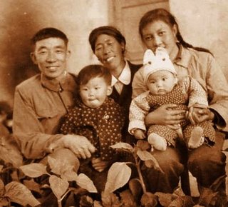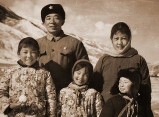 1968年,这是在西藏军区里的我家门口。门上的“忠”是我父亲用剪刀剪出来的,为的是表达对毛泽东的忠诚。我母亲抱着我妹妹。而我,实在是长得像个男孩子。中间的妇女是阿佳益西啦,带我和我妹妹的保姆,我们之间感情很深。